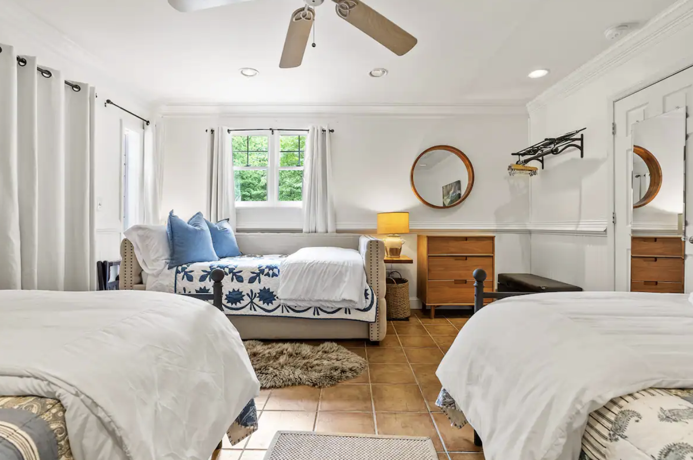 two queen beds, twin trundle bed, shared bath,